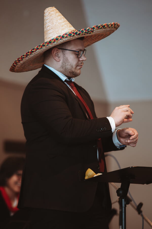 Nachdem dann der Saxofonist Gerd mit einem kurzen geistlichen Impuls allen Mut gemacht hatte, das neue Jahr mit christlicher Zuversicht und Gelassenheit zu begehen, folgte zunächst die Vertonung des Chorals „Alles was Odem, hat lobe den Herrn“ bevor sich dann eine Folge bunt gemischter Melodien anschloss. Von Melodien der Comedian Harmonists über einen Marsch bis hin zu Melodien von ABBA war alles dabei, sogar ein Tango und ein Mambo mit dem Titel Tequila. Statt hierzu zu tanzen, zelebrierte der Dirigent Willi Klein dann doch lieber eine Zubereitung dieses Getränks, stilecht mit Salz, Agaven-Brand und Zitrone. Dazu durfte der spanische Sombrero nicht fehlen.