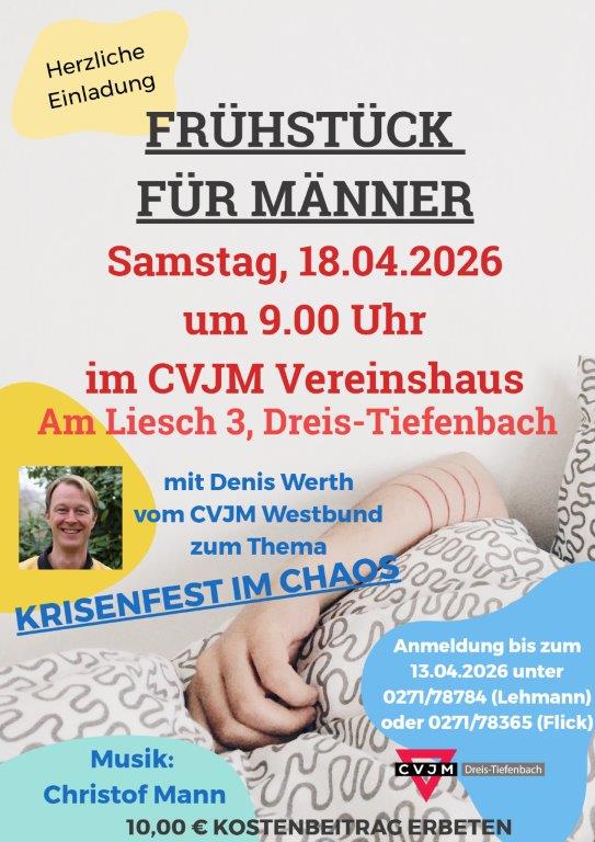 Es verspricht ein abwechslungsreicher Vormittag zu werden: Neben frischem Kaffee, Brötchen und allerlei Köstlichkeiten erwarten Euch auch musikalische Beiträge von Christof Mann. Außerdem freuen wir uns auf ein Wiedersehen mit Denis Werth vom CVJM Westbund.